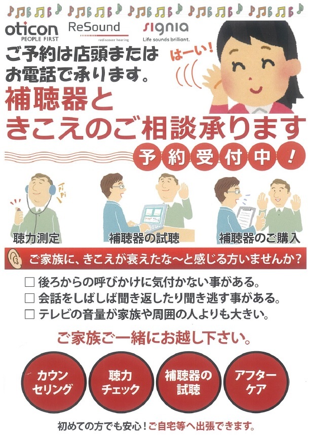 タバタ薬局ではきこえのご相談を承っております。初めての方でも相談員がご自宅等へ伺ってご相談や測定を行っております。